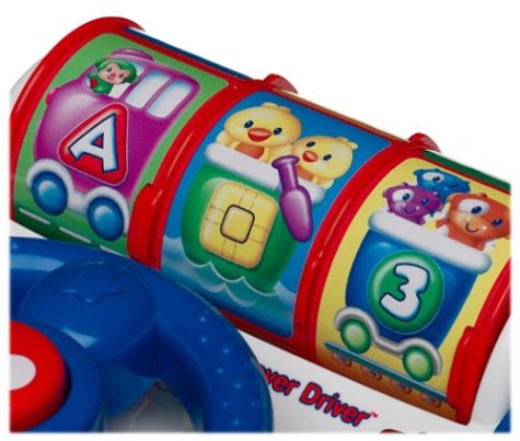- Interactive steering wheel controls movement of 3 jumbo learning rollers that teach numbers, letters, animals, colors and shapes- Dashboard stoplight and gas pump, police siren and radio press buttons feature fun phrases and sound effects