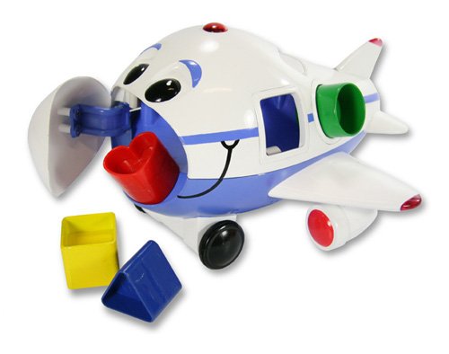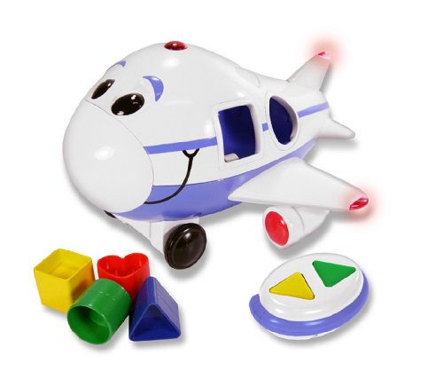 Fasten your seatbelt and let's learn about colors and shapes! Shape Sorter Remote Control Airplane is an interactive plane that will fly your child through learning their colors and shapes. There are two play modes: learn the colors and shapes, and find it. Play by simply inserting the plastic shapes into their slots. Your child can also be the pilot and bring the plane to life with the infrared remote control.