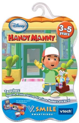 V.Smile Handy Manny Fix it right with Manny and the tools! Join Manny on 3 different work sites and use the tools to get the get the job done. Light up a theater marquee, finish constructing a building, or drive through Sheet Rock Hills to deliver a trophy. Everyone has an important job to do, so lend a hand to Handy Manny! Features Game play stars Manny and all the tools: Rusty, Stretch, Dusty, Felipe, Turner and Pat! Curriculum includes Spanish language and problem solving 3 Learning Adventures and 3 Mini Games are based on popular TV episodes 4 Learning Zone games reinforce curriculum like logic, numbers, and spatial puzzles Challenge friends in 2-player, head-to-head competition