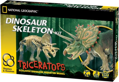 Thames and Kosmos Dinosaur Skeleton Model - Triceratops Build a realistic model triceratops skeleton. Learn about the dinosaur with a full color, fold-out information sheet and 3 dinosaur fact cards. Kit includes: skeleton model peices full-color instruction and fact sheet, three dinosaur fact cards. Ages 6 and up Not for children under age 3 years. Small parts: choking hazard All Thames & Kosmos products have been safety tested to the rigorous standards of both the USA and Europe.