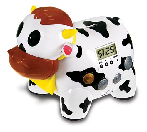 Moo-ve" kids to save, recognize coins and correctly count change with this smart bank. It identifies each coin as it is inserted with a spoken voice, tallies the balance, displays it on the LCD screen and challenges children with amusing, spoken phrases. To retrieve coins, simply press his nose and his mouth drops open. Size 9" L. x 5" W. x 7" H.Uses 3 "AA" batteries (incl.) Practicle Presents - Ages 5 yrs. +."