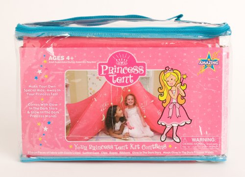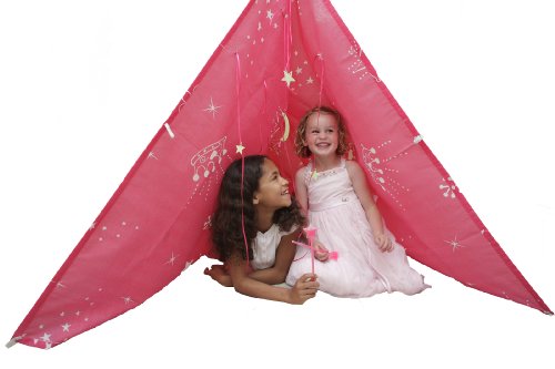 Create an enchanted nook in any princesss room for reading, playing or sleeping! Use the two pieces of princess fabric to create one large or two smaller tents and thread the enclosed cords through the elastic loops sewn onto the fabric to make endless variations of the tent. Use the clips and suction cups to attach the tent to windows, mirrors, rugs, beds. Once the tent is set up, string the ribbons through the glow-in-the-dark stars and planets and pin them from the top of the tent. Then enjoy the glow-in-the-dark magic wands in your tent!