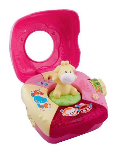 My 7 month old loves this toy! Ever since she was 5 months she enjoyes closing and opening the lid of this box over and over again. There are many cute little songs the girraffe sings. The toy spins around as song goes on making it fun and my girl loves it a lot. Just this toy alone keeps her occupied for about 20 min.
