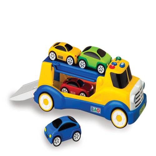 This smart, talking truck actually teaches children colors and numbers as they play! Its 4 electronic, push-button modes enable the truck to recognize each car by color, placement and how many are on the ramps. It asks children to place the cars on the ramps based on color and location and then reinforces their choices with helpful spoken phrases. The freewheeling 12L. x 5"W. x 5"H. truck and 3-1/2"L. cars are in durable plastic. Uses 3 "AA" batteries (incl). Ages 18 months - 3 years."