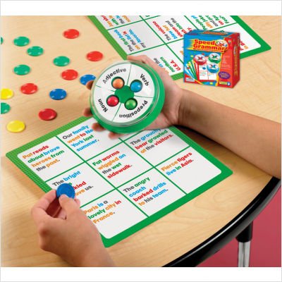 Grades 3 & up. This 3-in-1 bingo-style game will reinforce your students' understanding and proper use of the parts of speech. Students spin the shaker and race to find a sentence with the correctly color-coded parts of speech. Speed Grammar quickly builds grammar and reading skills as students make matches. Colorful cards, unique game shakers, and fast-paced game play offer a hands-on alternative to traditional grammar worksheets. Includes 3 game shakers, 12 double-sided cards, and 50 game markers. 2 to 4 players.