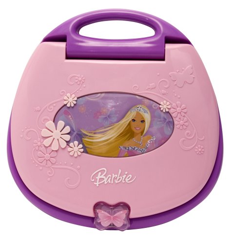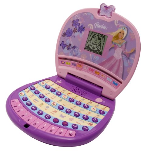 Barbie B-Bright laptop is bilingual and features 20 engaging and and exciting learning activities. Games are all designed especially for the Preschool or Kindergarten child to reinforce math, spelling, logic and sequencing in fun and enjoyable ways - with Barbie as host! LCD screen is lit with multicolored LEDs for a colorful effect - perfect for low-light conditions. Also features a musical keyboard for melody and music fun. Easily portable - snaps shut with a carry handle. Measures 10.5"L x 10.75"W.